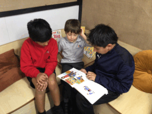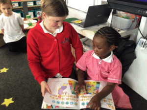 This afternoon, our Reception children enjoyed a special reading session with Year 5 pupils. The older children took the lead, sharing stories and reading aloud, while the younger ones listened with excitement. It was a lovely opportunity for both year groups to connect – building confidence, friendship, and a shared love of reading.