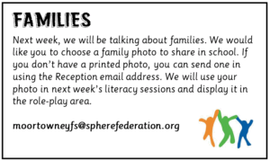Finally, thank you to all the parents/carers who attended the Reception welcome meeting on Tuesday. It was great to see so many of you. As always, if you have any questions or would like to share any home learning please use our Reception email moortowneyfs@spherefederation.org.