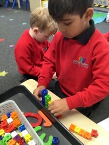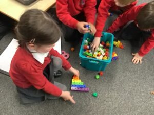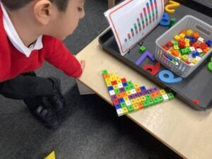 This week, we continued to develop our counting skills. Our main focus was the stable order principle—understanding that numbers always stay in the same order. To explore this, we used cubes, marbles, bottle tops and counters to build staircase patterns. We also had to use our super fine motor skills, especially when working with the marbles!