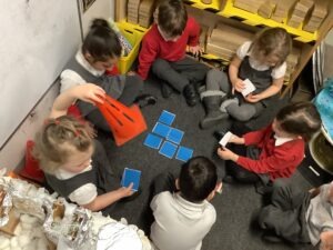 In Maths, we continued to develop our understanding of composition. We used the Hungarian number pattern (die pattern) to explore ways of making 5. We sang 5 Little Aliens in a Flying Saucer to help remember the pairs of numbers that make 5.
