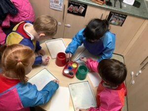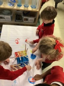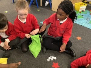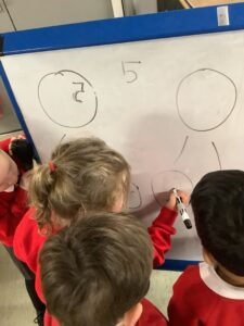 This week, the children consolidated their understanding of the composition of 5 using the familiar rhyme 5 Little Speckled Frogs. By singing the rhyme and moving the frogs during each verse, the children explored part–part–whole relationships. For example, they discovered that 5 can be made up of 3 and 2.