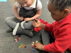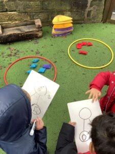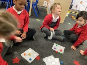 On Wednesday, we noticed there wasn’t enough space on the die frame for 6 aliens. To extend our learning, we used a double dice frame to explore numbers 6 and 7, understanding them as 5 and a bit.