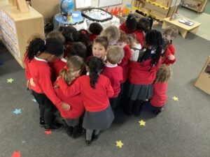 Our word of the week was huddle. To help us understand the word, we made our own huddle in class. Ask your child if they can explain what huddle means and use it in a sentence.