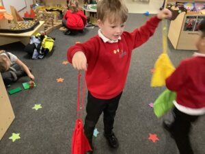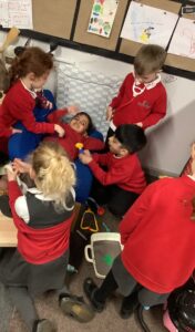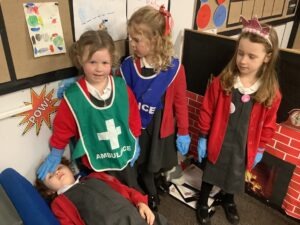 In provision, we linked our fiction story to non-fiction learning by role-playing real-life heroes. The children took on different roles and explored how people in these jobs help others in the real world. We had lots of poorly patients in our role-play area!