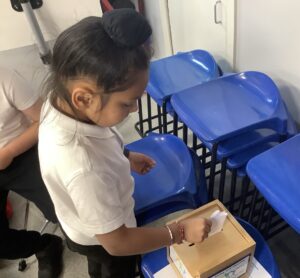 We use voting within the classroom. For example, what class reward the children would like or which book to read at the end of the day but this week it is our Junior Leadership Team elections so all the children had a difficult decision to make when giving their vote at the polling station.