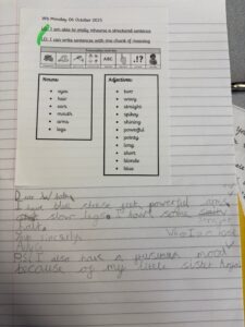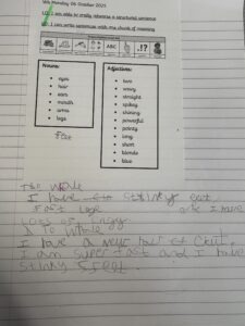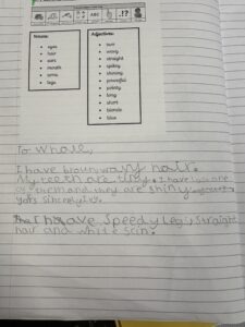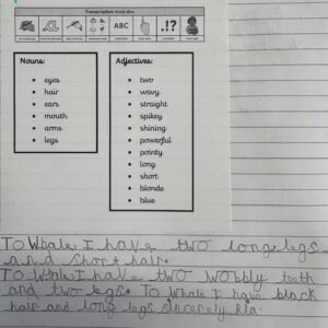The children were so excited to write back to Whale, telling him all about themselves. We’ve been focusing on our presentation skills and making sure to include capital letters, full stops, and finger spaces, as well as using commas in a list.