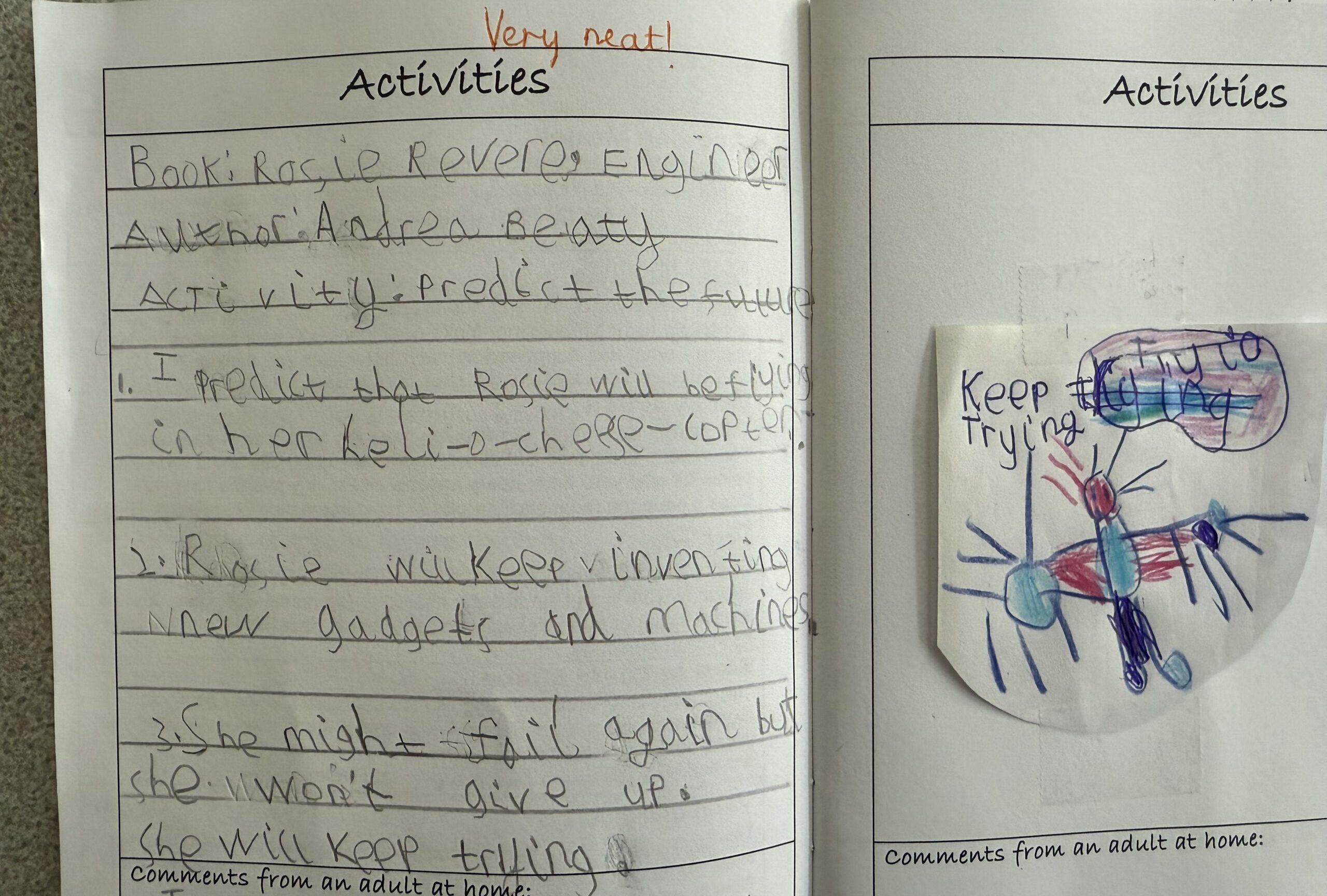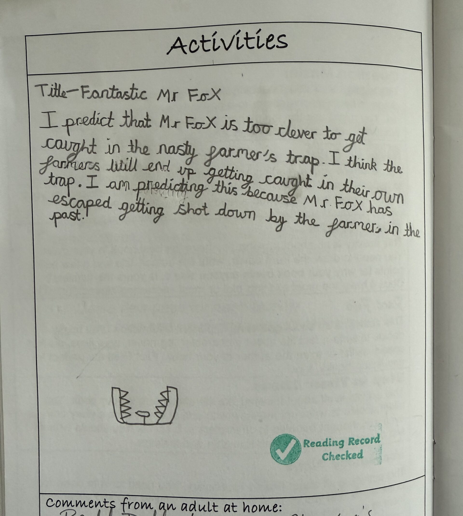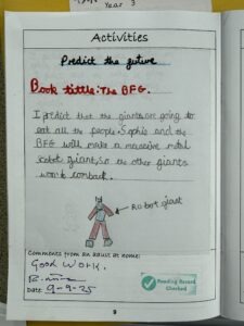The children really impressed me with their reading records this first week. The activity was ‘predict the future‘ which asks them to predict what may happen; in the next chapter, at the end of the book or in the sequel. These records are to help me keep track of the children’s reading progress so it’s fantastic to see the children’s evidence of this.