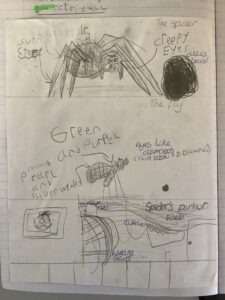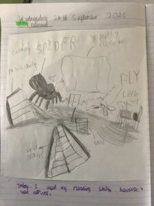 This week – in Reading – we have been looking at the poem ‘The Spider and the Fly’ by Mary Howitt. We have looked at a range of different skills but in today’s lesson the children used their retrieval skills to draw and label the characters and setting.