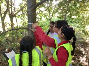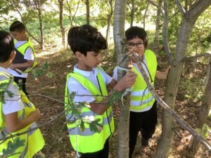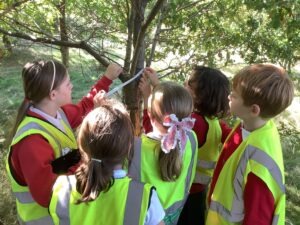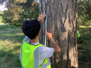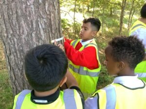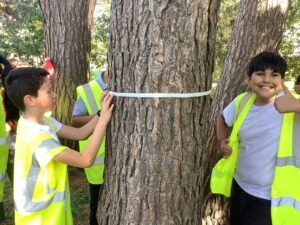 Today, Year 6 ventured to Moortown Park – an urban green space – to conduct their Geography fieldwork. The children were trying to measure carbon stores in the locality. Carbon stores are known as ‘places where carbon is stored in the environment’. To calculate this, they measured the girth (the distance around the outside of something thick) of different trees. They did this by sampling: a way of collecting fieldwork data without measuring everything.