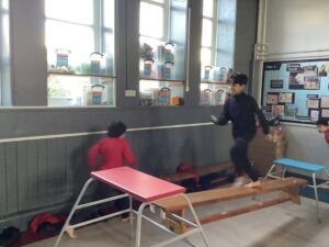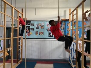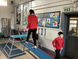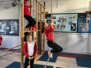 Travelling as been our focus for this week, where we’ve practised moving around the space in different ways: high, low, wide, narrow, with many points of contact and few. We also has a lesson today using the equipment; we explored the apparatus with controlled and balanced movements.