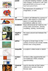 Help at home: Asking your child to define these terms. Is there another piece of art around your home that you could place on the table above and why? Or, discuss the key vocabulary for this topic. Can you use it in a sentence?