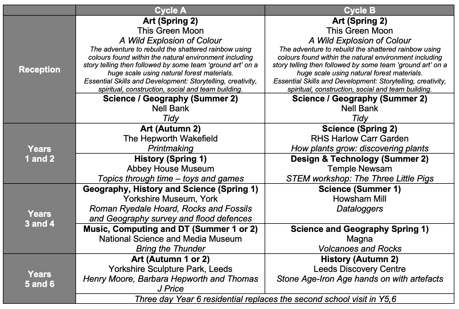The visits are mapped out across Reception, Key Stage 1 and Key Stage 2 to ensure progression and continuity (subject to change eg if a venue is temporarily closed). The 2025-26 school year is in Cycle A.